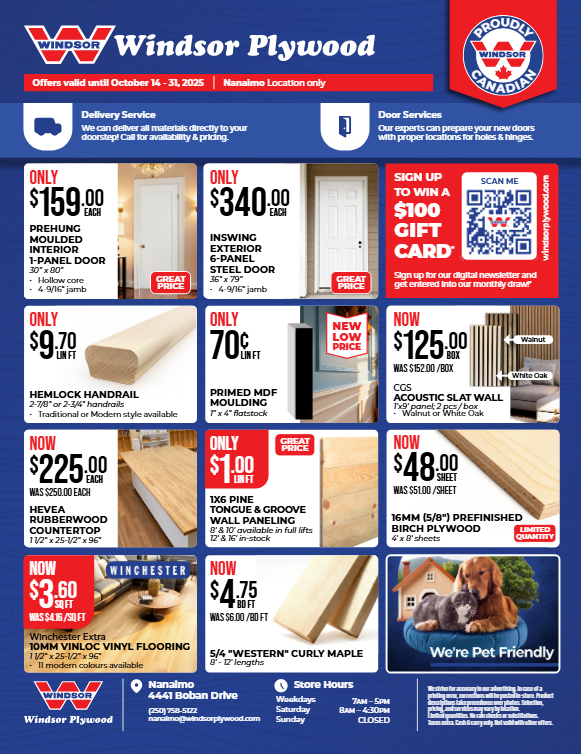 Windsor Plywood Nanaimo is your destination for high-quality finishing materials and building products. Browse our premium flooring, interior and exterior doors, elegant mouldings, and complete line of wood products including sheet goods, hardwoods, and specialty lumber. With an extensive range of profiles and sizes, you can find the right fit for any design or renovation.