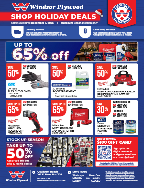 Windsor Plywood Qualicum – Windsor Rentals proudly serves Qualicum Beach and surrounding communities including Parksville, Errington, Coombs, Dashwood, Bowser, Qualicum Bay, French Creek, Whiskey Creek, Dunsmuir, Nanoose, Nanoose Bay, and Deep Bay. With trusted products, hands-on expertise, and service you can rely on, we are the experts you need to know!