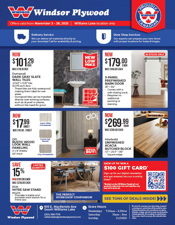 Windsor Plywood Williams Lake serves Williams Lake and nearby communities including 150 Mile House, McLeese Lake, Likely, Horsefly, Alexis Creek, Quesnel, Kersley, Big Lake, 100 & 108 Mile House, Lac La Hache, Riske Creek, Redstone, Alkali Lake, Puntzi Lake, Nimpo Lake, Anahim Lake, Bella Coola. With friendly service, accurate quotes, stock checks you can trust, and steady communication, we are the experts you need to know!